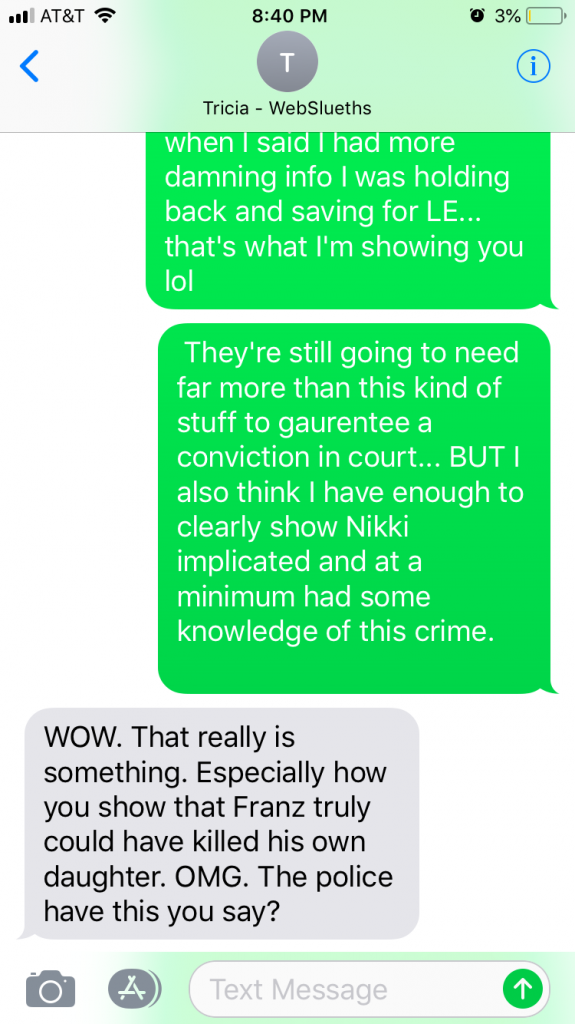 I spoke to Tricia and she's fine with Wes posting their text screenshots if that's what he feels like doing.
