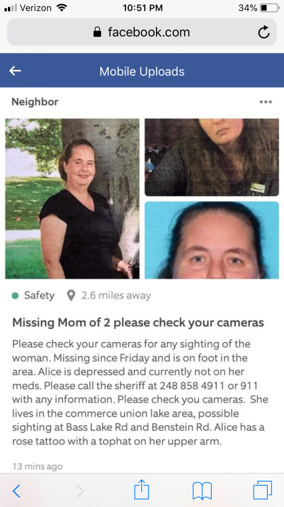 MISSING PERSON: The Oakland County Sheriff’s Office is requesting the assistance of the public in locating Alice Phillips of Commerce Twp. On Friday, June 21, 2019, Alice went for a walk and never returned home. Alice was last seen wearing a blue and grey sweatshirt, blue jeans, is 5’3” tall, 120 pounds and has shoulder length auburn hair. She also has a large tattoo of a rose with a top hat on the upper arm. The OCSO continues to search for the missing subject. Anyone with any information is asked to call the Sheriff’s Office at 248-858-4911.