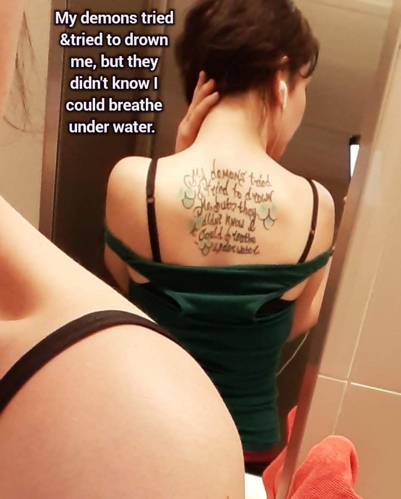 She had another tattoo that no one has reported. On her back. It's a quote that says, "My demons tried & tied to drown me, but they didn't know I could breathe under water."