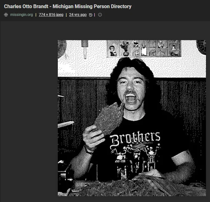 Adding this photo of Mr. Brandt, which I appeared in Bing search results. The same photos is cropped on the Charley Project's page, and appears as a thumbnail on theDoeNetwork's webpage. I followed the link shown in the attachment (with a posting date of 24 years ago), but when I searched that website for his file, the website returned a blank page. Not sure if these versions of the photo and their former sources contribute anything useful to the conversation, but adding them to the collection just in case. The internet is ever changing.