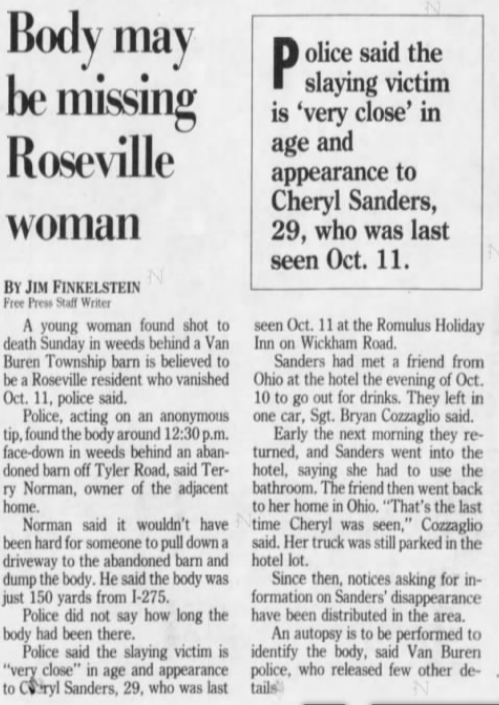 She was last seen in the lobby of a hotel where she'd stopped to use the rest room. The female friend she was out with saw her in the lobby and drove off assuming she was safe. Cheryl's decomposed remains were found behind a barn on Tyler Road in Van Buren Twp (a suburb of Detroit). COD was a single gunshot wound to the back.
