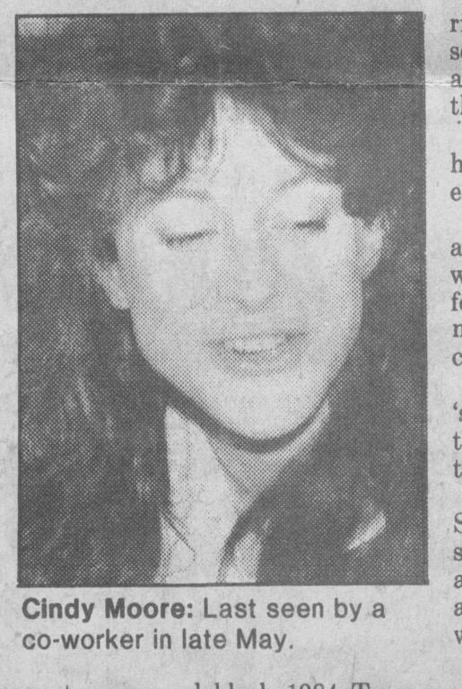 Those aren't the same people. Moore is a fairly common name in this area (and probably throughout the US). Cindy was never found, alive or dead. One local man, Rick Retell, who was one of Cindy's co-workers, spent many years looking into her disappearance. He died a few years ago without ever finding her. I believe the police more or less gave up after a while. I don't think there's been any official activity on the case since the 80s.