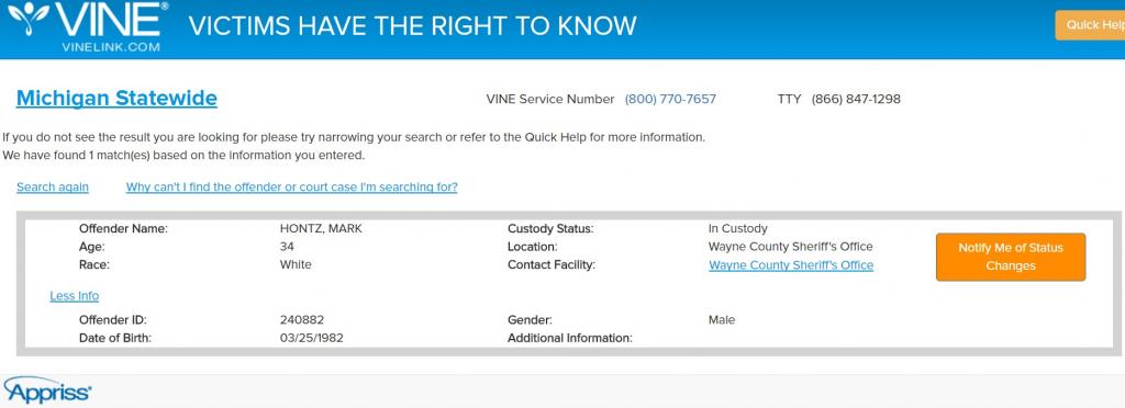3. Third attachment: According to vinelink, MH is currently in custody/has not been bonded out.