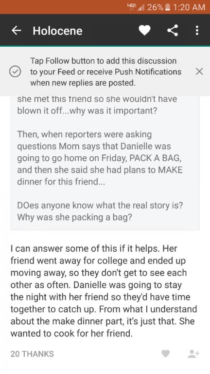Thank you that helps a little but some details still seem fuzzy. So was the friend that moved away to go to college recently moved back to town? Since I have read she had to work latter that night, then it seems the answer is yes. But if she lived near Danielle now, why even make plans for a night when she could not stay all night? It makes no sense. I'm wondering if the truth is that this friend was Danielle's alibi for something--in case her family asked she was going to the long time friend's house and the friend would back her up if her mom called--but Danielle really had other plans and her friend knew she was never coming over but agreed to go along if her mom checked up on her. Hopefully, if this were the case the friend would spill by now and say she never really had plans, unless she really doesn't know where Danielle was going. The friend may feel like she had to continue to say they had plans so LE would take the disappearance seriously--maybe whatever Danielle was doing she always texted or called her friend to let her know she made it home safe but that night there was no communication and so the friend worried and went the next day to check her apt? Or maybe I'm missing something and over-thinking all this? :thinking::dunno: