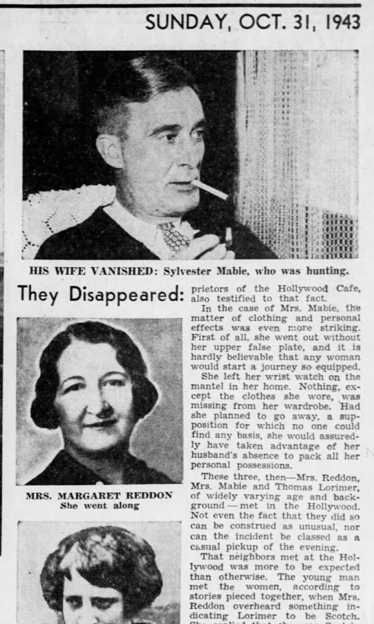On Oct. 15, 1937, three people vanished from the Hollywood Cafe in Melvindale, leaving nothing but a shroud of mystery. The victims in this case were Thomas Lorimer, 24 years old, 17736 Flint, Melvindale; Mrs. Artie Mabie, 42 years old, 17295 Palmer, Melvindale; and Mrs. Margaret Reddon, 35 years old, 723 Lansing, Detroit.