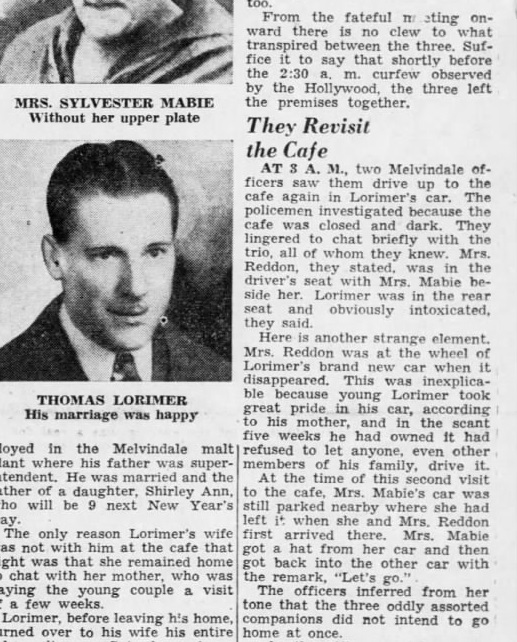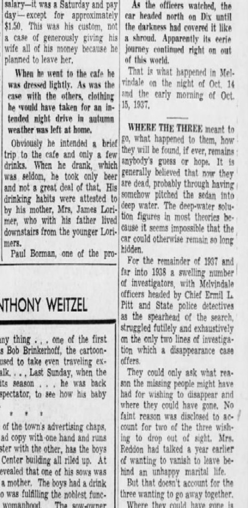 News reports revealed that Reddon and Mabie arrived at the Hollywood Cafe first and later became acquainted with Lorimer when he came in. At about 1 a.m. Oct. 15, they all left in Lorimer’s new car and then returned to the cafe at 3 a.m. At that time, they were seen by Melvindale Officers Harry Bryngelson and Leonard Anderson. The officers pulled up to the vehicle and discovered Lorimer, Reddon and Mabie inside. After a brief conversation, the officers then released the trio, seeing they knew all three of them and nothing appeared wrong. The officers then watched the vehicle and occupants drive away in the darkness on Oakwood toward Dearborn. The officers also wrote down the vehicle description as a 1937 Olds with a Michigan license plate 71-697.