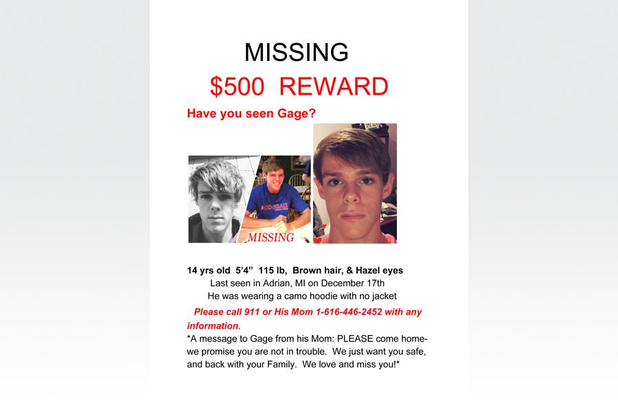 Gage Karn, a freshman at Lenawee Christian School, was reportedly last seen Dec. 17 in Adrian, wearing a camouflage, hooded sweatshirt with no jacket, according to a poster circulating on Facebook and around Adrian.