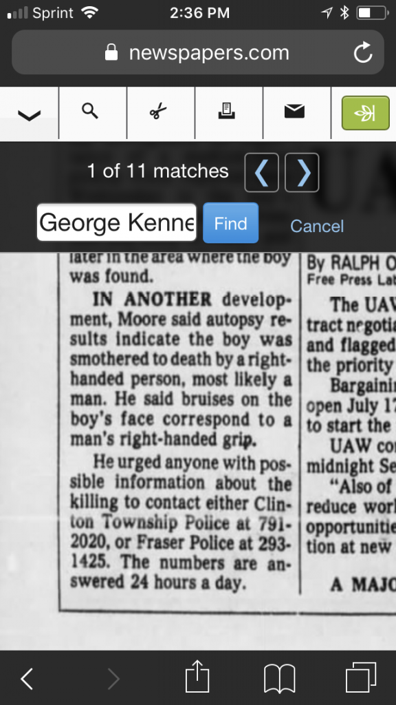 On Wednesday June 27, 1979 at 1:30 he was playing in front of his Fraser, MI home where he lived with his mother Rene (parents recently divorced). Police were notified of his disappearance at 4 pm. His body was found around 6pm by an 8 or 9 year old boy riding their bike on Kerner rd south of Clinton River rd. (7 miles northeast of his home) Police stated he was smothered to death by a right handed man, his body showed no signs of violence and was NOT sexually molested. Time of death between 2pm and 6pm. Apparently early on they had two suspects but were questioned and released, first man was said to be cleared couldn’t find anything saying the second was cleared of any wrong doing. Two witnesses saw an older modeled white Cadillac with white vinyl top near where the boy was found between 3 and 4pm. Suspiciously that night, George’s father, George Sr. was playing softball between 6pm and 7:30pm, unknowingly 300 yards from where his sons body was found. George Sr. voluntarily submitted to a polygraph test, passed and police said he was not a suspect in the murder. The Fraser and Clinton Township Police formed a 20 officer task force to work the case. After about the second week of July 1979 I wasn’t able to find any other mention of the case.