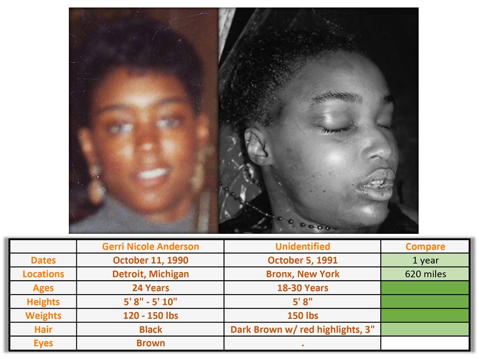Gerri allegedly was going to Chicago in October 1990, and the decedent was found in New York City, 600 miles away in the opposite direction, in October 1991. But Gerri could've been tricked or kidnapped, or she also could've lied and gone voluntarily elsewhere. Anything can happen in a year.
