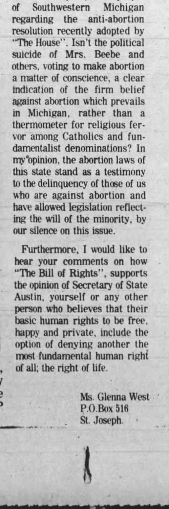 @Needtoid Can you post links to the info you read regarding Glenna's potential pro-abortion views or public statements? It appears there's some confusion regarding her stance on the issue. Assuming the article posted by @StarrChance was written by this Glenna West back in June 1977, it reads as though she was against abortion. Either way it could be an interesting avenue for investigators.