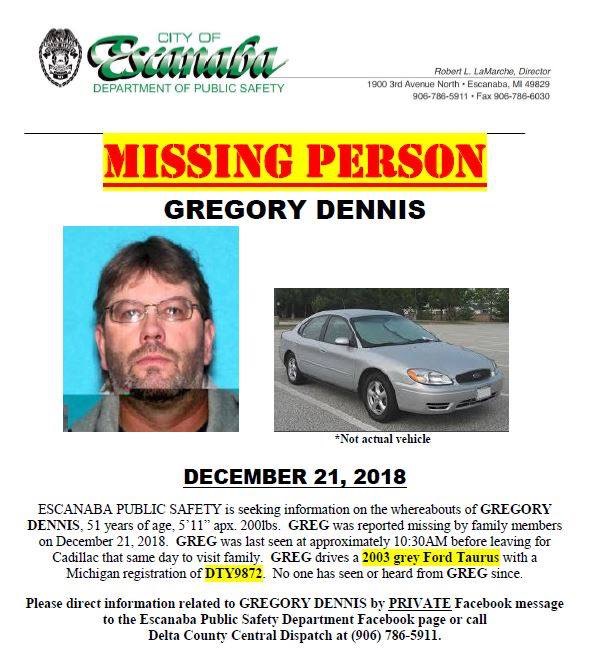 The Escanaba Public Safety Department is asking for the public’s help in locating Gregory Dennis, 51. He was reported missing by his family on Dec. 21.