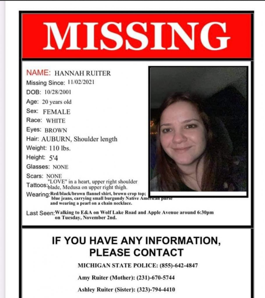 Troopers from the MSP Grand Rapids Post are asking for your help in locating HANNAH RUITER, age 20, 5'4", 120 lbs. with brown eyes and brown hair. She was last seen on 11/3/21 in the Muskegon area. Anyone with information is asked to call the MSP at 616-866-4411 or 911.