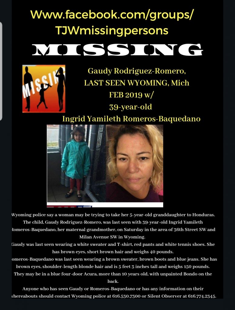 The child is Gaudy Rodriguez-Romero, who Wyoming Police say is Hispanic, about 40 pounds with an unknown height. She has short brown hair and brown eyes. Police say she was last seen wearing a white sweater, a white T-shirt, red pants and white tennis shoes.