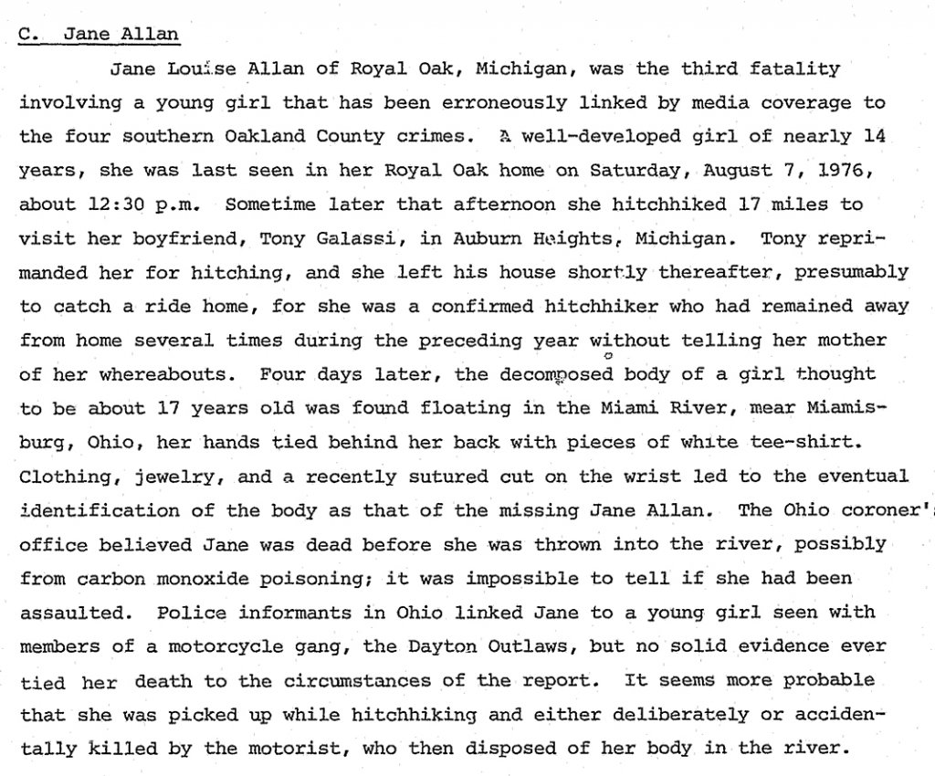 Jane Louise "Janey" Allen, 13, was last seen attempting to hitchhike between Pontiac and Royal Oak, Michigan Aug. 8, 1976. Three days later, her body was found in the greater Miami River in Miamisburg, Ohio. Her wrists had been tied behind her back with torn strips of a t-shirt. Jane had died of carbon monoxide poisoning.
