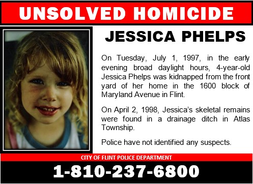 If you have any information in Jessica Phelps’ case please contact the Flint Police Department at 810-237-6800 or Crime Stoppers of Flint & Genesee County at 800-422-5245.