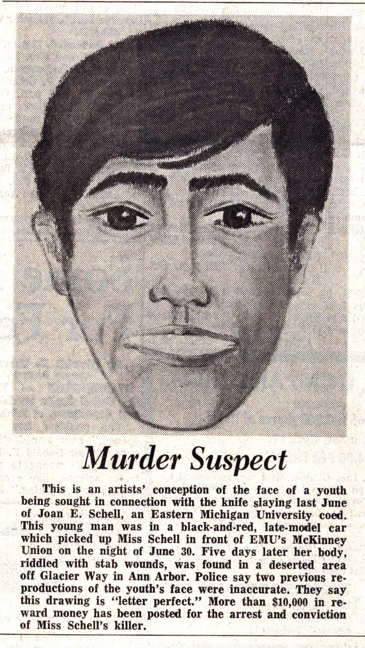 Collins also writes that Davis had a "twin brother" with a car fitting the description of the vehicle a witness saw giving another victim, Joan Schell, a ride in. (Joan Elspeth Schell, age 20 whose body was found on 5 July 1968. She was last seen hitchhiking near the EMU student union on June 30, 1968. Days later, her body was found just outside Ann Arbor. Her throat had been stabbed and slashed, and her blue miniskirt was twisted around her neck.)