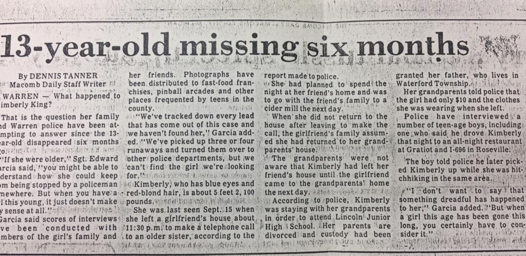 I was going to post the Macomb Daily article but someone beat me to it. It answers another poster's question about how the guy snatched the girl without being seen. The story on the Charley Project is not correct. She vanished at night not in the morning. She hitchhiking down 9 Mile Road at night--that's asking for trouble. I've been living in Warren since '98 and the corner where Ms. King made her phone call is very close to where I live. Gratiot, though, is a goodly drive. I don't know what would possess someone to decide to walk 4 miles down 9 Mile Road that late at night. I wouldn't do that and I was an adult at the time this girl vanished. So she was hitchhiking. Why a 12-year-old girl would do that is beyond me. I never hitchhiked in my life. I never accepted a ride from a complete stranger--well, once, but the circumstances were different and I wasn't hitching. So she may not even have vanished in Warren. Gratiot and 9 Mile is a different city--Eastpointe (called East Detroit in 1979). I doubt she made it to Gratiot. That's a long walk. Somebody got her somewhere along 9 Mile I would wager. Girls out there, NEVER EVER HITCHHIKE! It is NOT SAFE! This poor girl didn't deserve her fate but with a little common sense she could easily have avoided it.