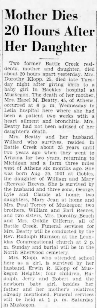 According to the article; at her death, Mrs. Hazel Beatty had a total of six children: Dorothy (who preceded her in death a day earlier), three sons and two other daughters - Mary Jean being the youngest at about age 8 or 9.