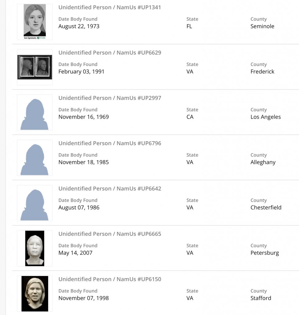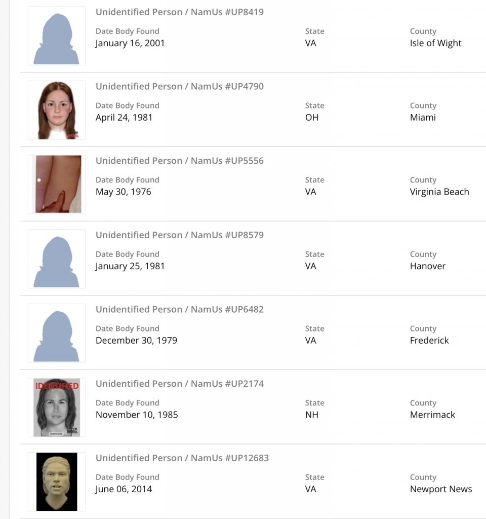 UP6279 was identified as well but they still show on the list of exclusions.OT, but I can't find UP6259 in NamUs - has she been ID'd?