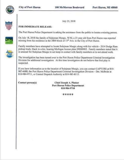 Sulejman Murgic, 23, was reported missing on July 18 from his home in the City of Port Huron.