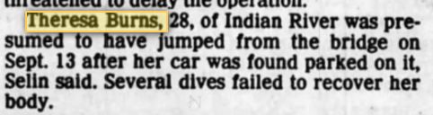 Circumstances: It is believed that Theresa Burns jumped off the Mackinac Bridge. Her body has not been recovered.