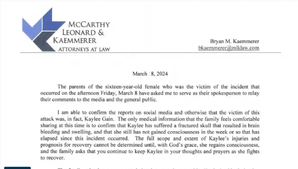 "Bryan M. Kaemmerer of the law firm McCarthy, Leonard & Kaemmerer confirmed the victim of the assault is Kayleen Gain."