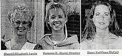 Sherrill Levitt was born on November 1, 1944, and was age 47 at time of her disappearance. She was 5 feet 0 inches (1.52 m), 110 pounds (50 kg), with short light blonde hair, brown eyes and pierced ears. She was a cosmetologist at a local salon and a single mother, and was described as being very close to her daughter, Suzanne Elizabeth "Suzie" Streeter. Streeter was born on March 9, 1973 (age 19 in 1992), was 5 feet 5 inches (1.65 m), 102 pounds (46 kg), with shoulder length blonde hair and brown eyes. Her distinguishable marks included a scar on her upper right forearm, a small mole on the left corner of her mouth, and pierced ears (left ear pierced twice). Streeter's friend, Stacy McCall, was born on April 23, 1974 (age 18 in 1992), was 5 feet 3 inches (1.60 m) and 120 pounds (54 kg), with long dark blonde hair and light colored eyes.[1]