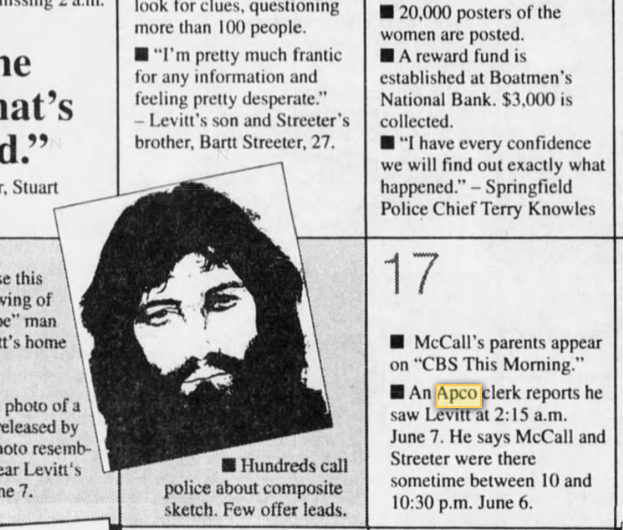 The Apco clerk saw Levitt at 2:15am. The girls supposedly left Battlefield a little after 2:15am. So it's interesting to know if they all three crossed paths or not back to the house.