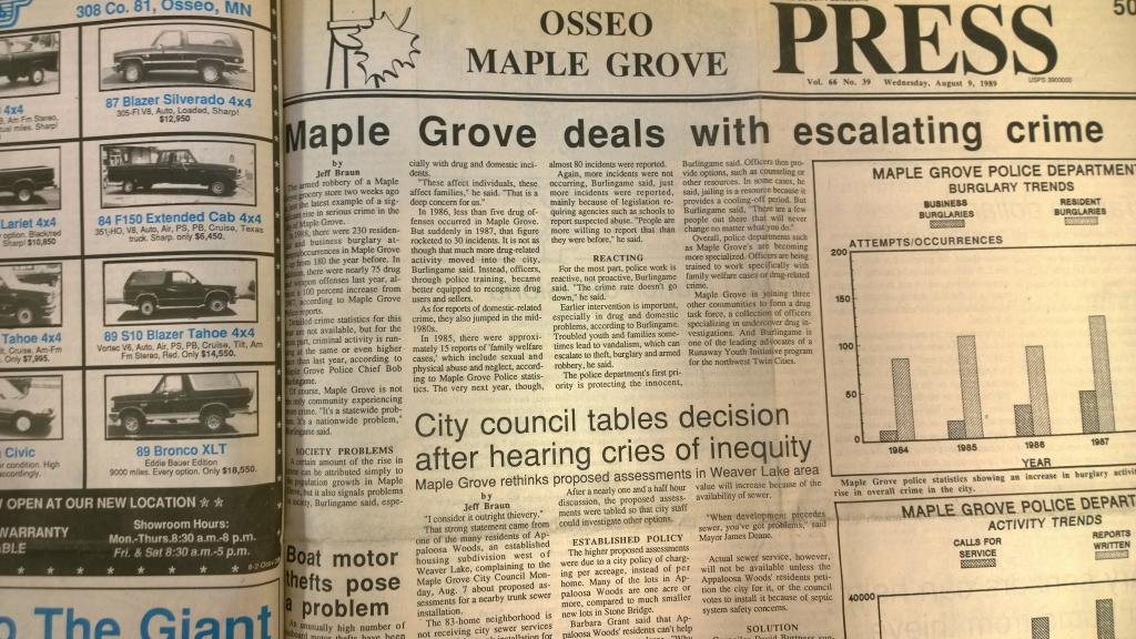 Here is an article about escalating crime in Maple Grove. Again from the Osseo Maple Grove Press.
