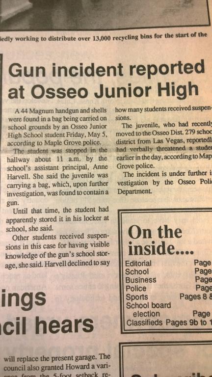 An article on a gun incident at Osseo Junior High. Unfortunately, I don't remember if this was the 5th of May before, or the 5th of May after Amy disappeared. But I think it does show that the time around when Amy disappeared, there were, in fact, serious issues at her school and in the area at the time of her disappearance.