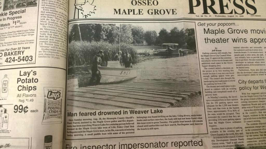 The file uploader doesn't seem to be working for me, but if someone wants to look it up, there is a story in the Maple Grove Osseo Press on Wednesday August 23 1989. Describes a search for a man first noticed missing on August 20th (fifteen days after Amy went missing). He was believed to have drowned in Weaver Lake. The police searched for him for several months, never named him, and apparently (from talking to people who vaguely remember the event) they froze his accounts. Not sure if that is relevant, but reviewing the paper for several months before and after Amy's disappearance is an interesting experience. No resolution to this case is ever published in the paper. It's extremely weird.