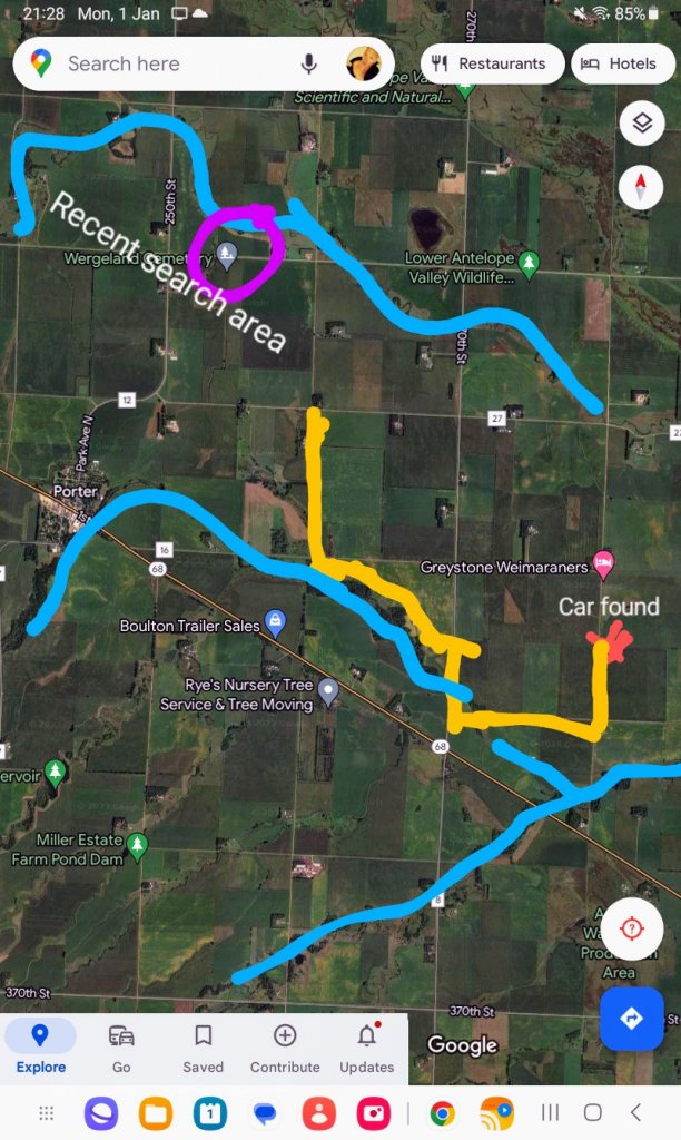 I have also indicated in the purple circle something that concerns me. This is the Wergeland cemetery. It's smack bang right in the middle of where the cadaver dogs keep hitting on scents. I'm not in any way knowledgeable about SAR dogs so I'm happy to be corrected. When the lead searcher tells us that the scents in mud creek are being washed into the water, suggesting Brandon's remains are somewhere in the fields around...what if the scents are merely being washed down from this cemetery? It's probably a stupid suggestion but it did come into my mind.