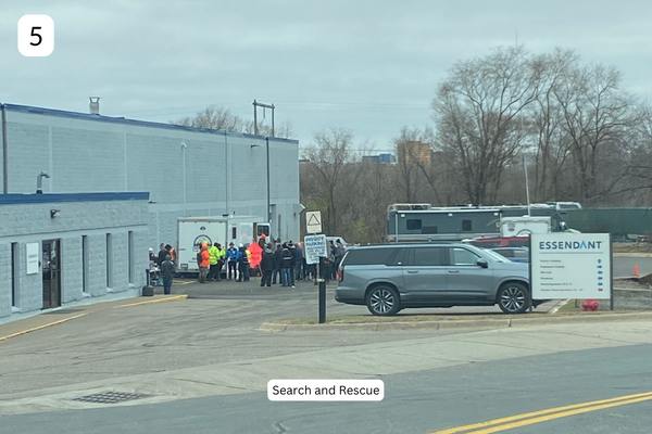 I just wanted to give a quick update that Search and Rescue was at the scene this morning. I observed a white Search and Rescue vehicle, a giant gray truck/van marked Incident Command Center, and around 20-30 people in the parking lot of a business called Essendant, an office supply company.