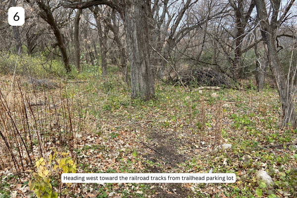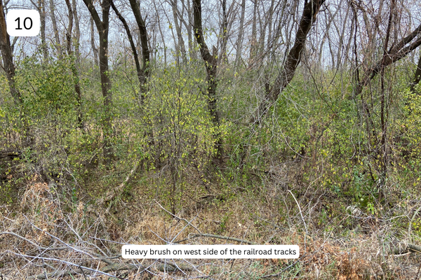 We parked at the trailhead and walked directly into the brush heading west toward the railroad tracks. See photo 6. I have walked the railroad tracks in the past to get photos, so I knew how dense the brush was here. You can tell the area has been cleaned out quite a bit by the parks department or whoever is in charge, there were piles of sticks and downed branches piled up and little paths in the grass, but there is no established trail here. This particular spot isn't where Bryce is believed to have entered, it's just where it was easiest for us to get in, but the terrain is similar all around this spot where the businesses end and the state park area begins.