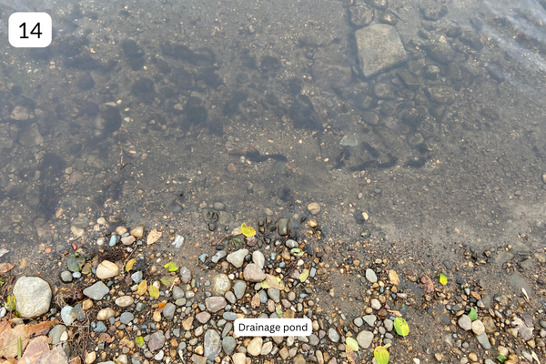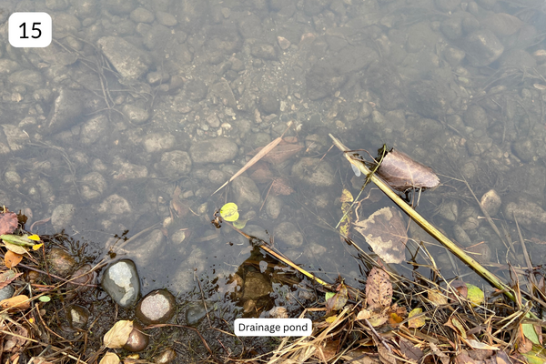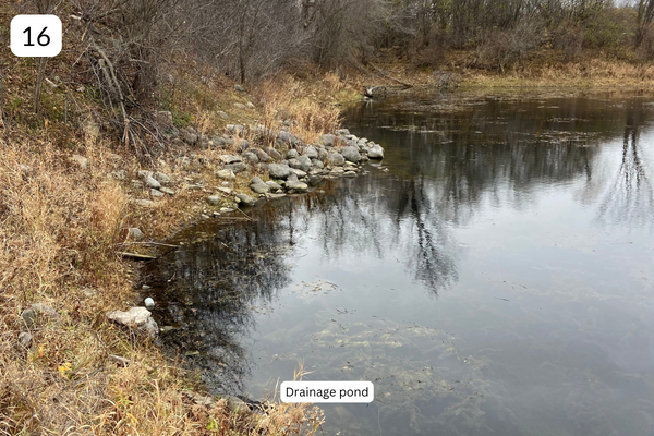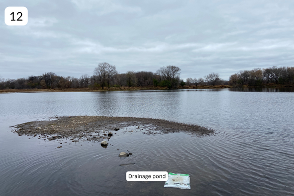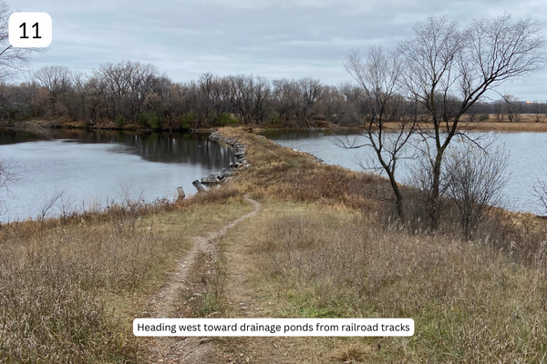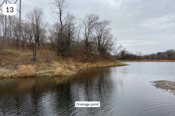 When we got to the drainage ponds, we left the tracks briefly. Photos 11-16 show one of the areas of interest: the drainage ponds. Several large drains let out into these ponds (lakes?). The water is not perfectly clear, but I was surprised how not muddy it was. There is considerable debris in the water - algae, aquatic plants, sediment. But it is not mud like I thought it would be.