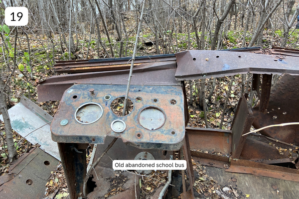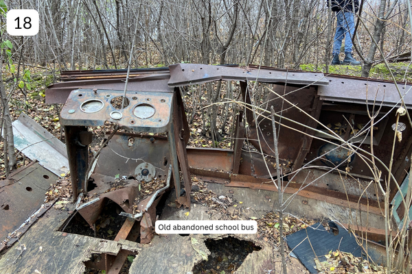 We encountered an old abandoned school bus in the state park area - included in photos 18-19. I also observed a piece of plastic in a tree near one of the drainage ponds that appeared to have a red stain on it, in photo 20. Blood maybe? It's a concerning thing to see, but we didn't see anything else around, just a lot of random trash.
