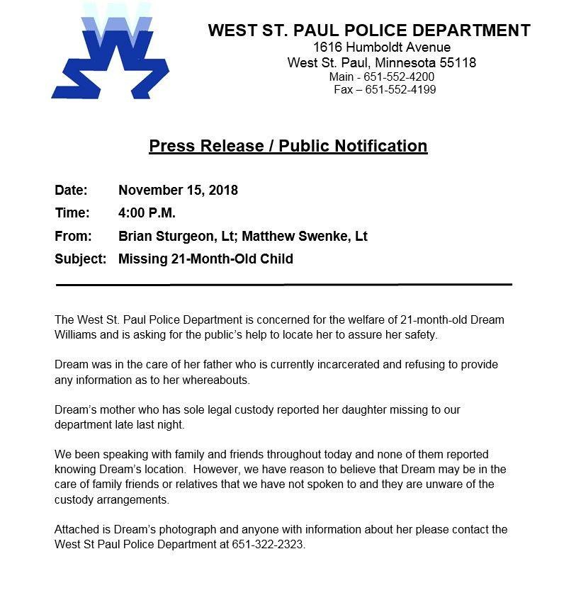 The West St. Paul Police Department is seeking the public's help in locating missing 21-month-old, Dream Williams. Please see the following press release. If anyone has information about Dream, please contact us at 651-322-2323. City of West St. Paul