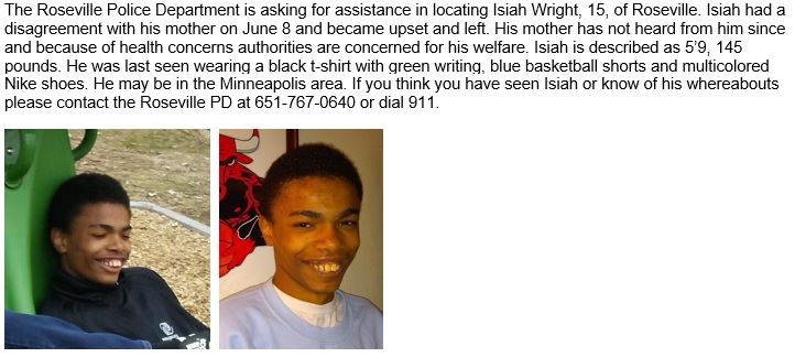 We are asking for assistance in locating Isiah Wright, 15, of Roseville, described as 5’9, 145 pounds, see attached photo for more details. If you think you have seen Isiah or know of his whereabouts please contact the Roseville PD at 651-767-0640 or dial 911.