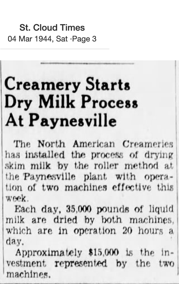 • 1944-3-4 st cloud times - creamery starts dry milk process at paynesville.png