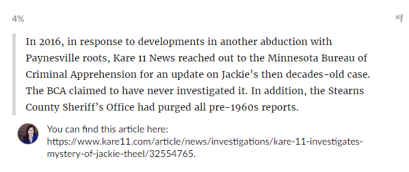 Good evening! I am the writer who wrote the latest newspaper piece about Jackie Theel for Forum Communications Vault series. First of all - thank you all you Websleuths for the insight I received by reading through this thread. I was hoping to clear up some things that I think have been misunderstood, one of which is the thought about the teacher that saw an adult Jackie Theel getting off a Navy ship. I do not think that it was Jackie's teacher Dorothy Gladke that was the "former Paynesville teacher." I think it was a different former teacher from Paynesville. However, I cannot verify that information. I do not think that the Paynesville Press in its 2004 article would have said "a former teacher" if it would have been Gladke, it would have said, "Jackie's former teacher ..." They were interviewing Jackie's sister Annabelle, who received the letter, and I think she would have said Gladke if it had been her who wrote to Annabelle about the adult Jackie sighting.