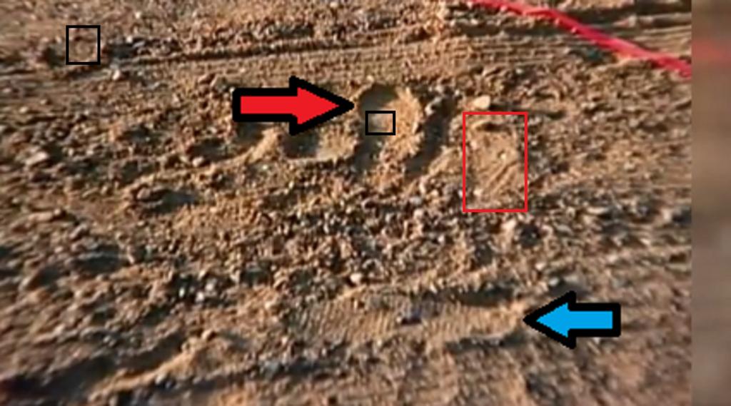 Possibly, but it is so pixilated it could be anything. To confirm one way or the other, you would need much better quality close up shots. Does not explain why there are no prints before "the last prints" that would be within Jacobs stride length. The upper left black box object would have required a turning step to the left and would have caused more mounding on the right side of "the last print".