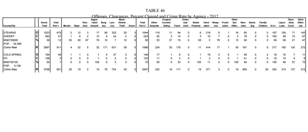 Everyone should be asking them questions. The Stearns County Sheriff's Office has a clearance rate of only 38% of their caseload as you can see by the Annual BCA Crime Stats. I've included a comparison with Cold Spring police department with far less resources at their disposal coming in at 55%. If you only got 38% of your job completed, how long would you have a job? Not sure you want to hear them comment anyway considering in 2005 Sheriff Sanner was quoted by the Maple Lake Messenger (Josh G's hometown newspaper) saying "It's likely Josh wandered into a heavily swampy area and sank in the mud".......WHAT?!?! I've lived in the Saint Joseph/Saint Cloud area my whole life. I spend many hours outdoors, doing many different recreational activities, not once have I experienced, have I ever heard of someone in the area, or anywhere for that matter being consumed by man eating mud. The small number of cases where people have lost their lives by what some may call "Quicksand", only sank waist deep and died of exposure. It takes one heck of an ego to go on record insulting the intelligence of the missing, as well as the missing's family by making such an outlandish and uneducated stupid comment such as that. He wouldn't even acknowledge him as missing being there was no evidence of foul play and because he was an adult. No clothes, no bank activity, no car, no glasses.....Josh just walked away with nothing and without anyone ever seeing that young man again. Why did it take years to recognize him as missing? Why was assistance from Maple Lake volunteers refused by the sheriff's office? If someone is missing, why wait in starting a search for the individual. A life is a life, adult or a child they should all be treated the same and acted upon immediately. As far as naming POI's, the SCSO tends to do that with absolute disregard and based on complete lies....first hand experience, and I know this for a fact....and that's info straight from the horses mouth per say.