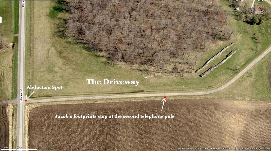 Possible evidence of a parked car on the driveway, Footprint end at 2nd Telephone pole, Boys make a Telephone call to Clearwater, MN. Pedophile with CB/Scanner Radio.