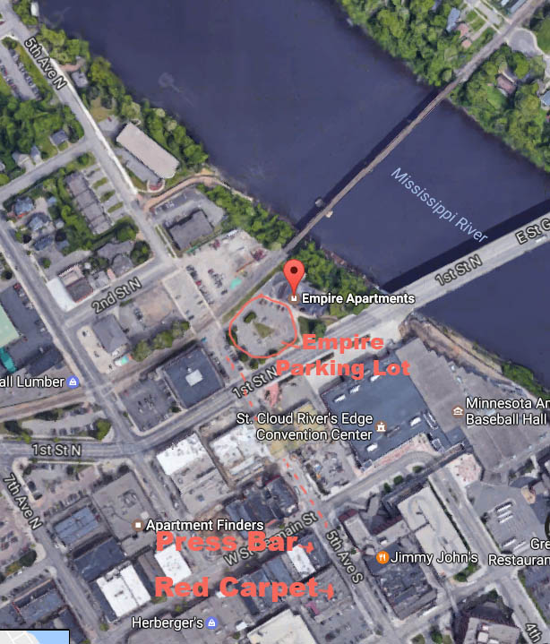 I made a map showing the location of the Empire Apartments and the river to the Red Carpet and The Press Bar so you can see how close it is to the river. He was walking North which is in the opposite direction of where he lives. SCSU college is South and also on the river.