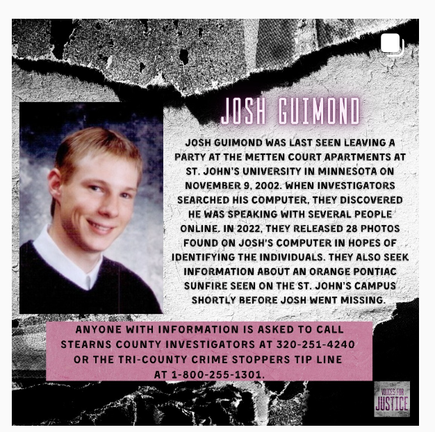 ''In 2002 Joshua Guimond vanished after a party at St. John's University. Despite massive searches, no Law enforcement has remained baffled by Josh's mysterious disappearance until new evidence was recently discovered on his computer.''