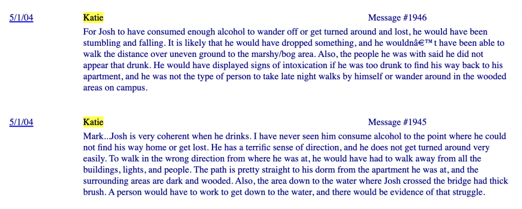 During my reading on FindJoshua - I read 100+ pages of messages which are all over the archived message board on there. Josh's dad and others were discussing "hallucinogenics" that may have been involved. Others thought Josh may have been a drug's "mule" (that is, someone who is transporting/distributing drugs) (Source: FindJoshua Message Board).