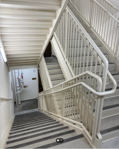 I do not know if the stairs were blocked in or open. If they are open as in the image below then theoretically it would be very easy for someone living in Maur House #104 to hop over into Maur #105 and vice versa: