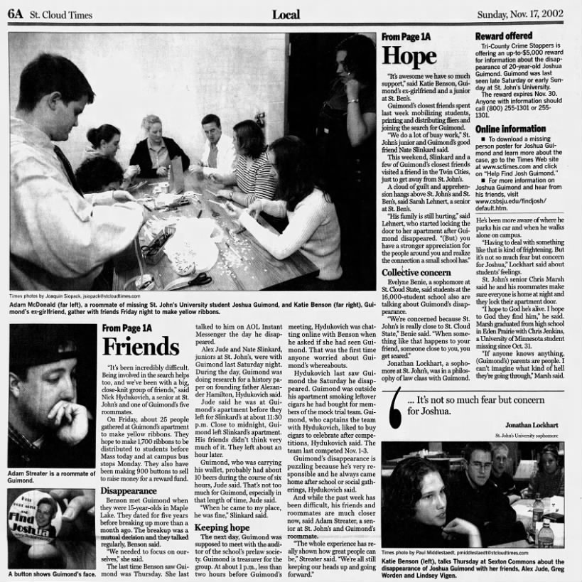 "My theory* Josh went to the no doubt concert that took place October 2002 in st.paul Minnesota he met an unidentified individual a college student exchanged dorm phone numbers and email addresses. He made plans to meet up with that unidentified college student and entered that individuals car at 12:35 am on the bridge the night of Nov 9th going into Nov 10th and taking to the interstate they went up to the university of Minnesota and Josh attended a dorm party and died there and it was covered up.