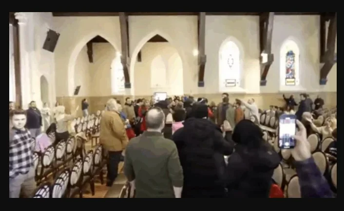 Here is a photo of the congregation during the protest. Most of them seem to be standing around and some perhaps leaving through an open side door. Some standing with hands in pockets. Someone filming with their phone.