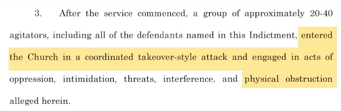 Apparently the plan (according to the indictment) was for the first wave of protestors come in calmly and unnoticed and sit down with the rest of the congregation. The 2nd part of the plan was for the 2nd wave to come and begin chanting, screaming, telling children their parents were going to hell, worshipping Satan, and loudly interrupting the service.